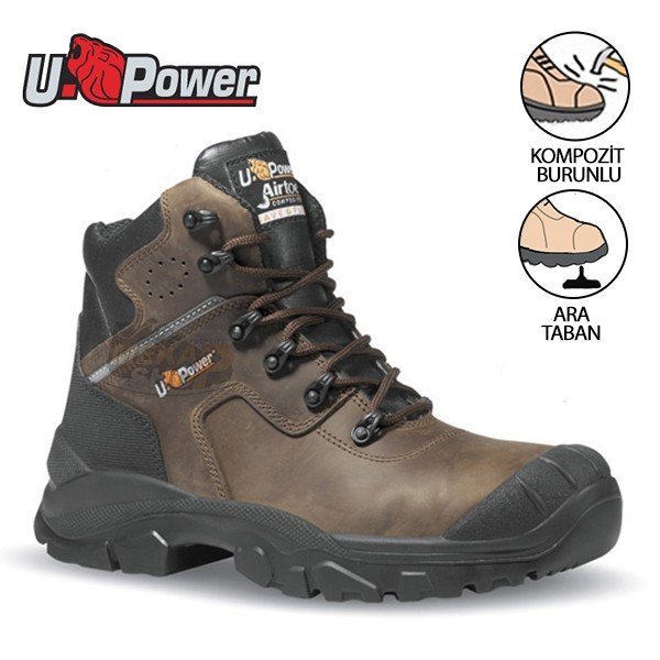 Upower Kompozit Burun: Nefes alabilen su geçirmez mabranlı, gözenekli Air Toe Composite burun koruyucu asimetrik gözenekleri ve su geçirmeyen, nefes alabilen mebran yapısıyla yoğun kullanım sonrasında bile ayağın kuru ve serin kalmasını sağlarken en yüksek güvenlik standartlarını da karşılar. (Kompozit Burun Ağırlığı: 50gr dır.)